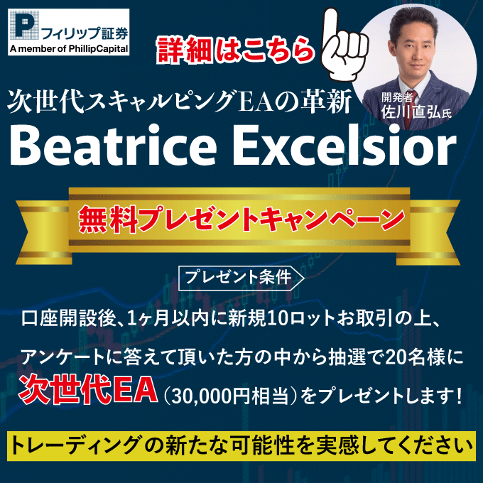 フィリップ証券が提供する「Beatrice Excelsior」無料プレゼントキャンペーンは、トレーダーに次世代の自動売買システムを体験してもらうための特別な機会です。このキャンペーンは、特定の条件を満たすことで、通常30,000円相当の高機能EA(エキスパートアドバイザー)「Beatrice Excelsior」を無料で獲得できる内容となっています。