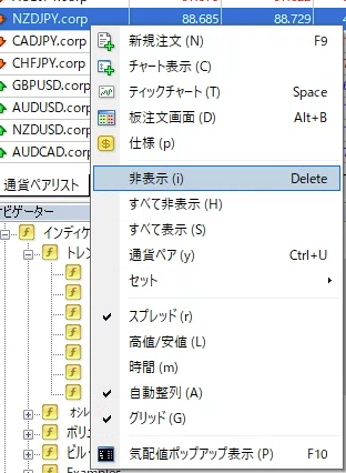 気配値表示には現在取引可能な通貨ペアや商品が表示されますが、表示される項目が多すぎると動作が遅くなる原因になります。